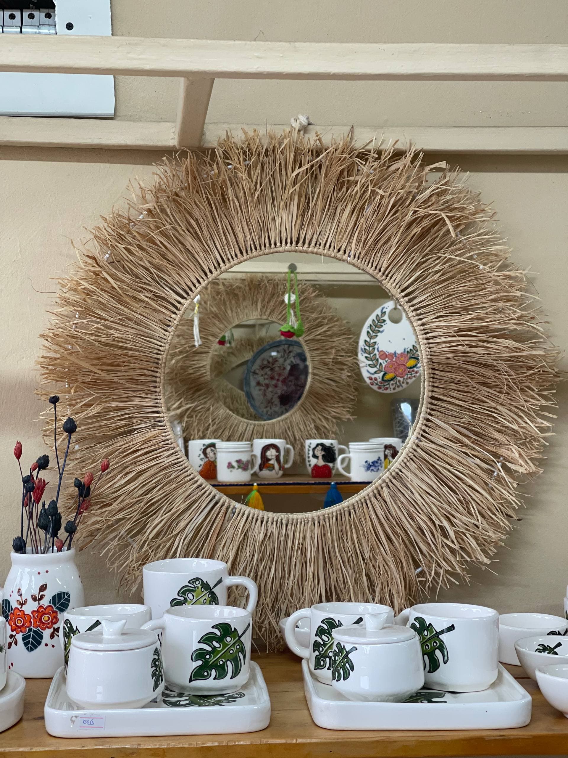 آیینه بوهو دکوراتیو رافیا طرح خورشیدی قطر 50 سانت